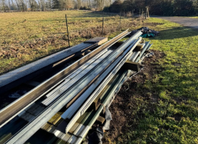 29 foot wide by 40 feet long steel building frame. ( to include.) main frame 6 x 12 beams 20 pound ,six legs at 18 feet high ,and three crossovers at 29 feet. All Perlin and gutter hangers are in place ready for gutters 12 gauge cees and zees 20 foot long and girder clips 3 foot on center and Pearl clips 2 foot on center for roof structure designed for 2 x 12 Doug fir Perlin (note) Perlin‘s not included. All main ,X bracing, nuts and bolts included to assemble.